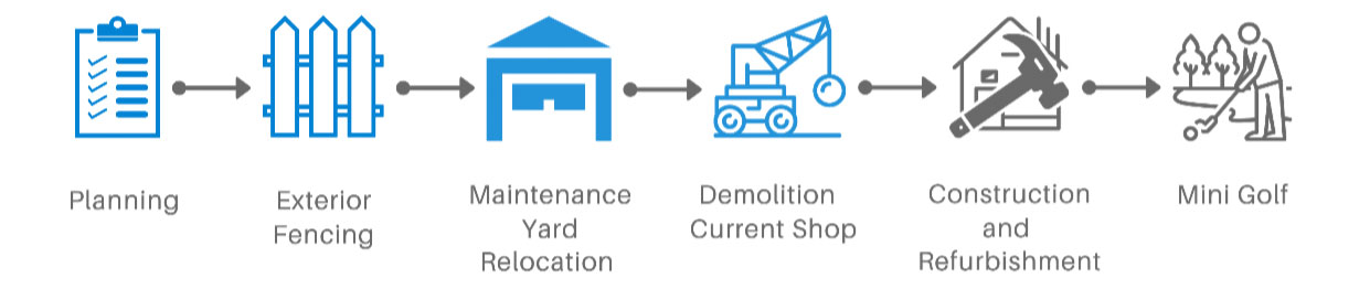 Two professionally designed 18-hole mini golf courses with a native aesthetic will be installed encompassing the area of our original maintenance shed, continuing across the previous entrance and the location of the current chipping green. Once the removal of the temporary site offices has been undertaken, construction of a new chipping green will take place in that location.